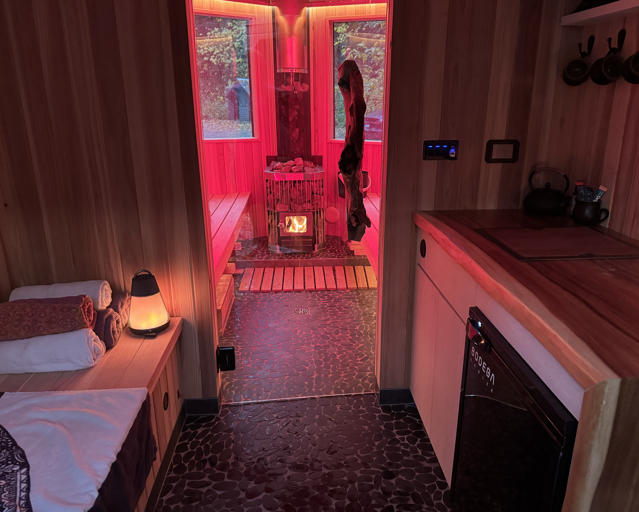 Our sauna is wood fired, so the heat can go as high as 200 degrees, but we recommend between 150-190. Once the temperature gets above 150, it is there for most of the day. You can cool down by leaving the sauna enclosure area and hanging out in the foyer or outside.